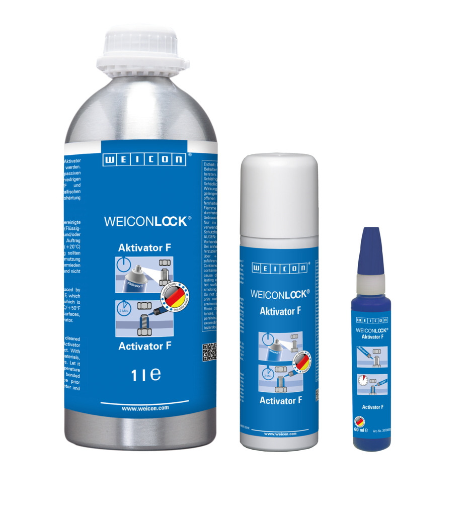 The cure time can be reduced considerably by pre-treatment with WEICONLOCK Activator F. The acticator is recommended for all passive surfaces and is indispensable at low ambient temperatures (less than +10 °C / +50 °F) and for large gaps. On nonmetallic surfaces, WEICONLOCK can only fully cure when the activator is used.
