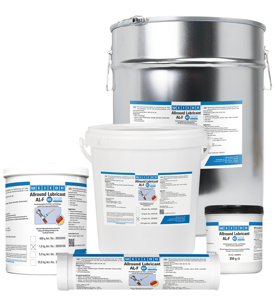 WEICON AL-F can be used to lubricate rolling and sliding bearings, joints, levers, sliding guides, spindles, spline shafts, camshafts, open gears, worm gears and all grease lubrication points. Thanks to its NSF registration, the grease can also be used in the food industry.
