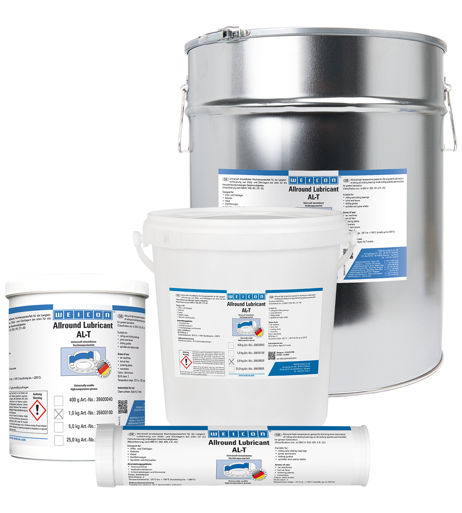 WEICON AL-T is suitable for rolling and sliding bearings, joints, levers, sliding guides, spindles, spline shafts, and at all sliding speeds permitted for grease lubrication. AL-T can be used in many industrial applications.