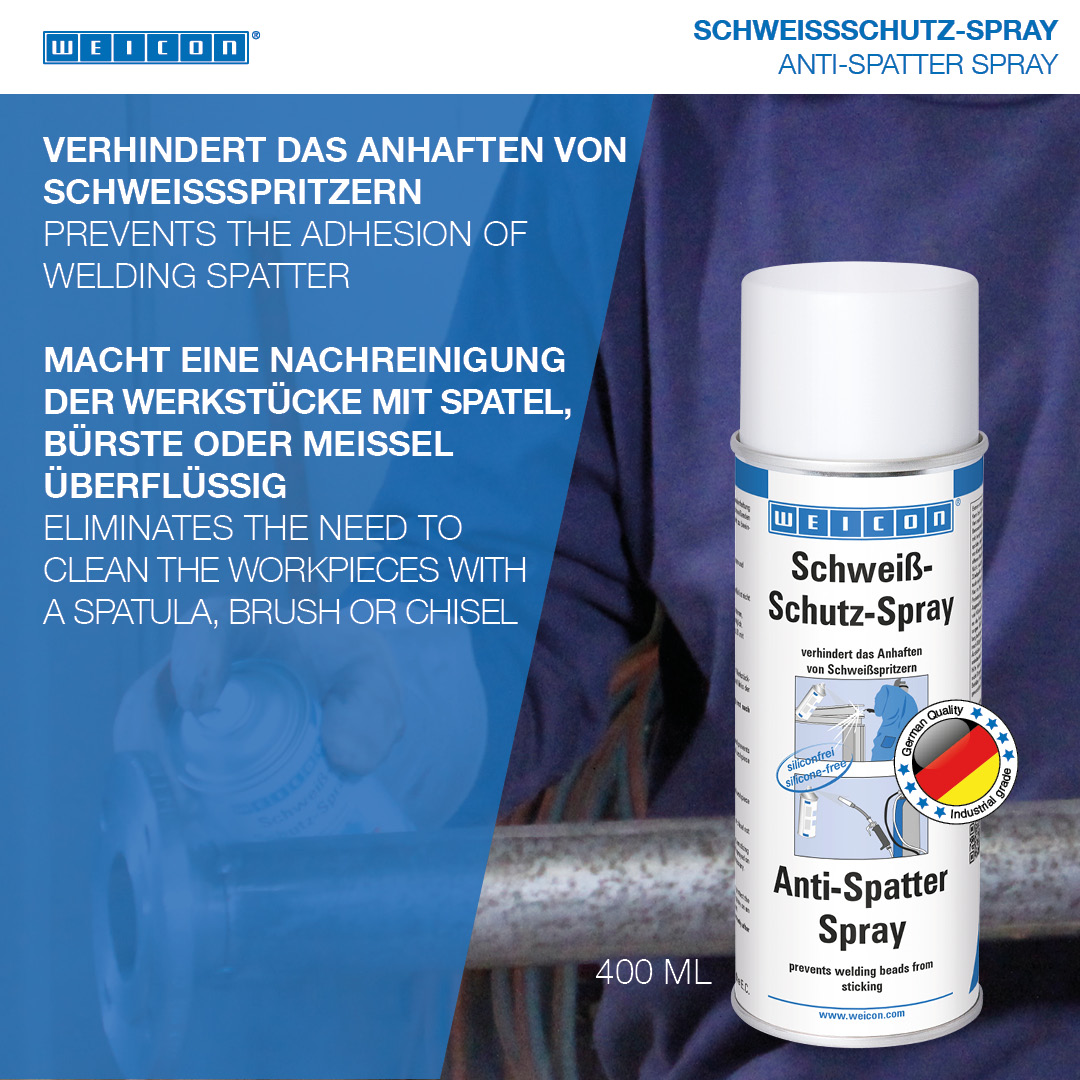 WEICON Anti-Spatter Spray prevents the adhesion of welding splashes on gas nozzles and workpiece surfaces, offers gap-free protection for the welding process, and makes follow-up cleaning of the work-pieces with a spatula, brush or chisel superfluous. The silicone-free spray is used to clean welding nozzles and to keep them clean. At the same time, it protects the work piece to be welded against the effect of weld splashes without impairing the welding seam. Post-treatment of the work-piece (such as bronzing, galvanisation, anodising or painting) is possible without special cleaning. Cleaning, e.g. with WEICON Spray Cleaner S, may be necessary solely in the case of excessive spraying.