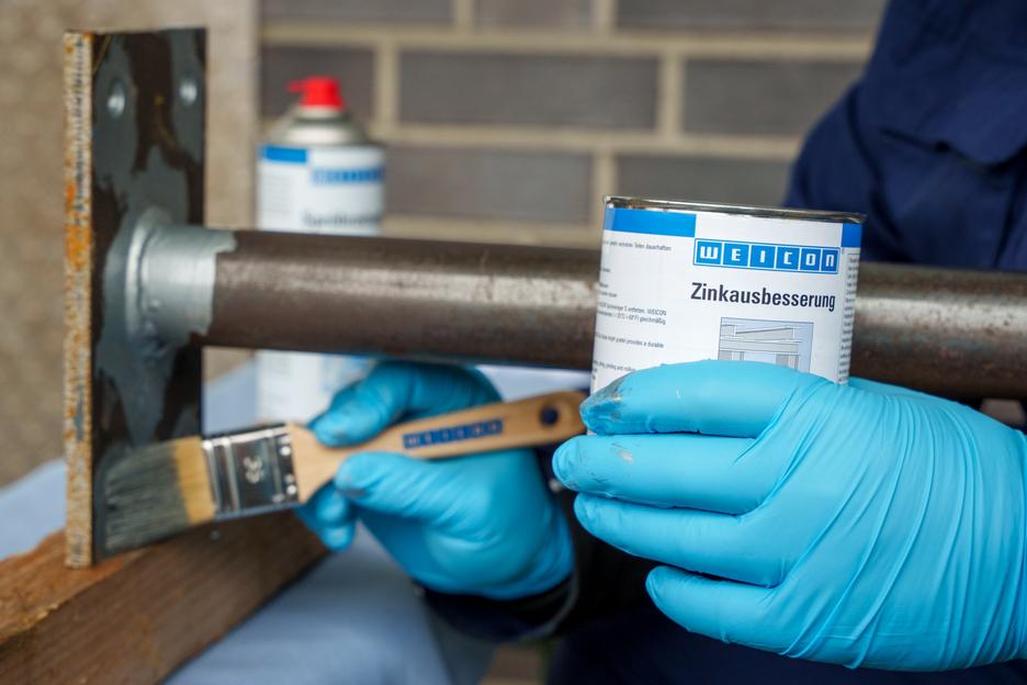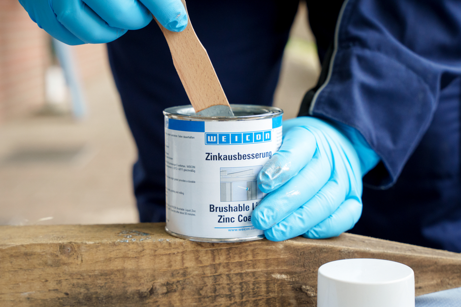 WEICON Brushable Liquid Zinc Coating provides active protection against corrosion for all metallic surfaces and is available in a colour shade matching galvanization. In the case of WEICON Brushable Liquid Zinc Coating, flaky metal pigments (flakes) settle parallel to the surface in several, spatially displaced layers on the substrate (shingle effect). That way, even when the layer thickness is low, high corrosion protection is achieved. Thus, it meets the requirements stated in the DIN EN ISO 1461 standard. This protects the surface longer from penetrating moisture. Optimal corrosion protection is achieved through the simultaneous electro-chemical effect.