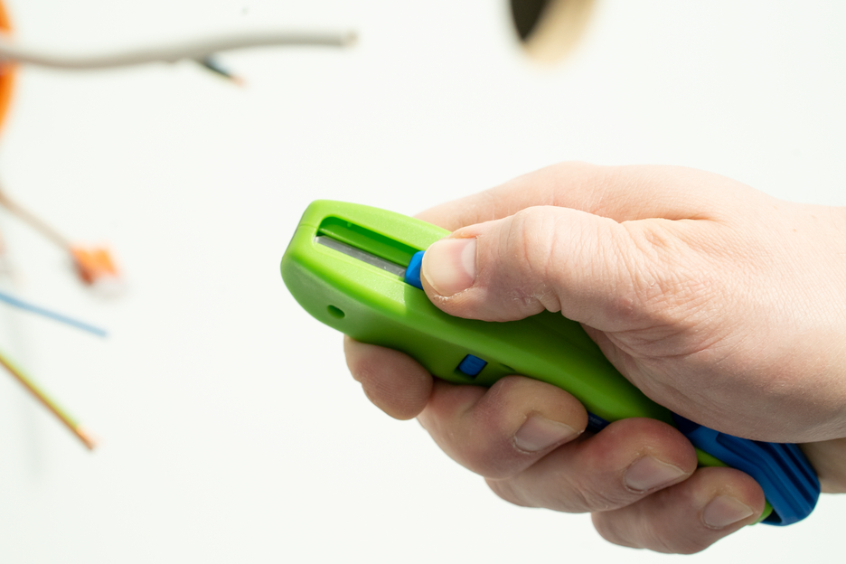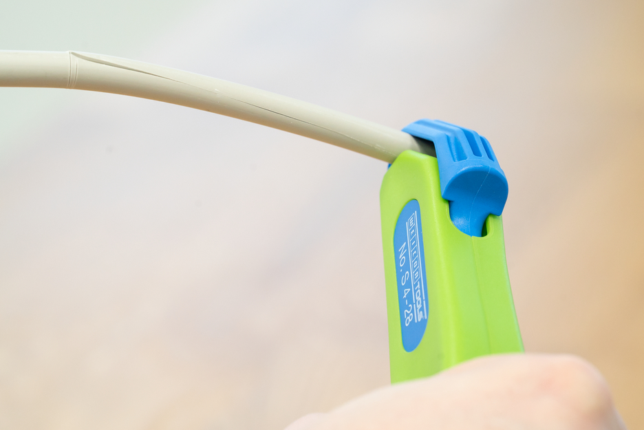 Narzędzie można łatwo dostosować do różnych średnic kabli dzięki niebieskiemu pierścieniowi na uchwycie. Kabeł umieszcza się na końcu narzędzia, przekładając go przez plastikowy zaczep. Po obrocie pierścienia można regulować głębokość cięcia. Na końcu obieraczki znajduje się druga, wyciągana po naciśnięciu niebieskiego suwaka, która umożliwia zarówno cięcia liniowe, jak i okrągłe.