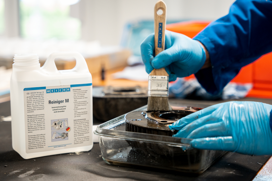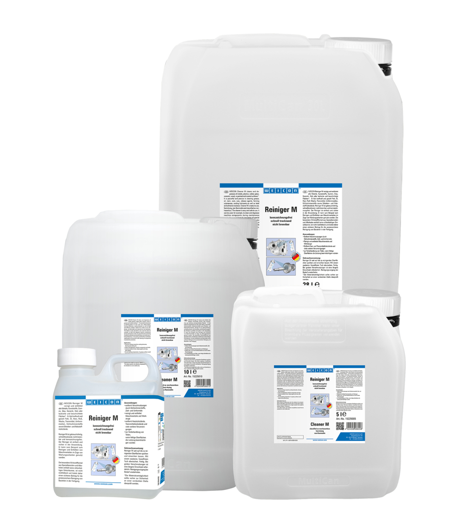 WEICON Cleaner M cleans and degreases all metals, plastics, rubber, glass, ceramic, wood, or painted and coated surfaces. It is powerful and precise in cleaning grease, oil, resin, soot, wax, release agents, forming substances, cooling lubricants as well as label and adhesive residues. Cleaner M is ready to use, fast-drying, non-flammable and classified as non-hazardous. The cleaner is easy and safe to use. It can be used, for example, to clean and degrease machine components and tools. Its special formula consisting of special surfactants and alcohols does not contain any silicone defoamers, is non-greasy and therefore contributes significantly to the process-safe cleaning of components in production processes.
