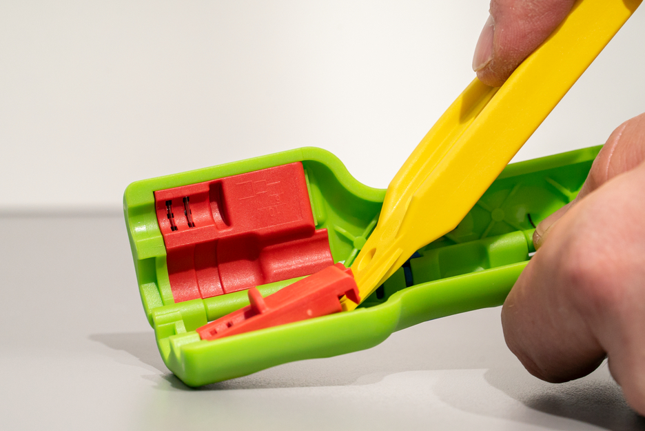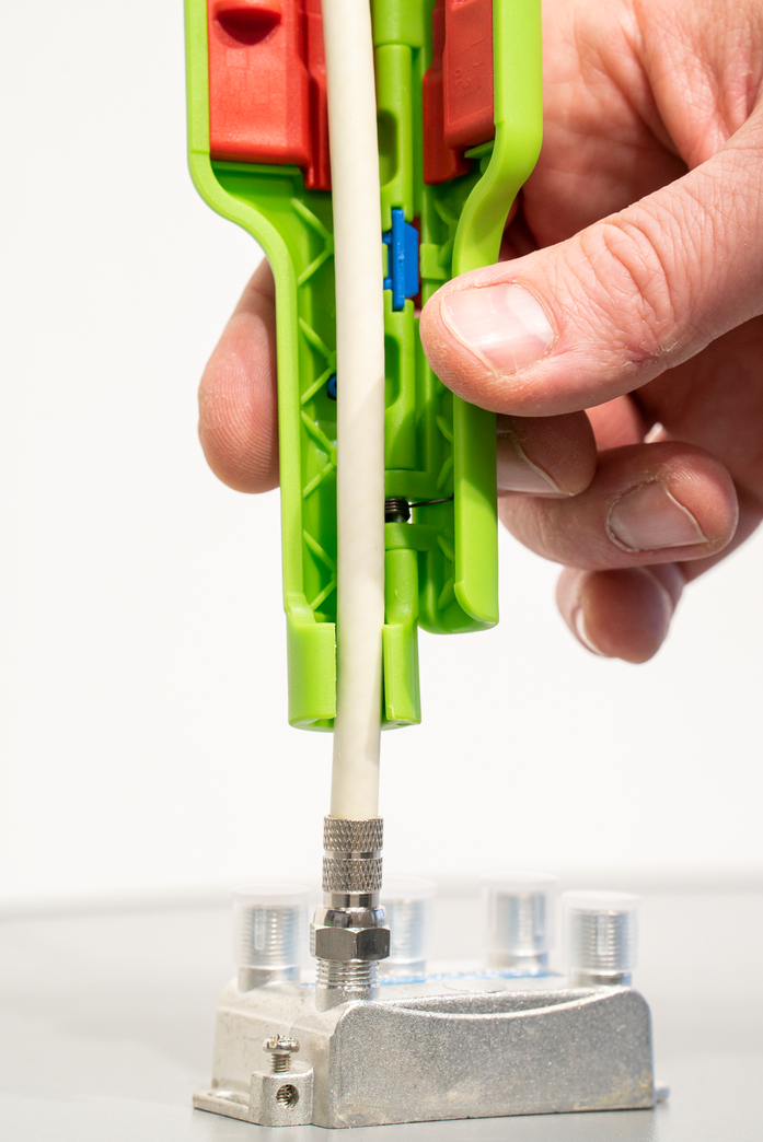Gripping jaws for screwing F-screw connectors onto the cable Space-saving mounting and dismounting of F-connectors thanks to integrated open hexagon with 11 mm wrench size (SW 11) Stripping without adjustment of the blades with length stop for common F-connectors (6 / 4 mm) Optional: Knife inserts for stripping to other defined dimensions available (e.g. compression connectors: 6.5 / 6.5 mm)