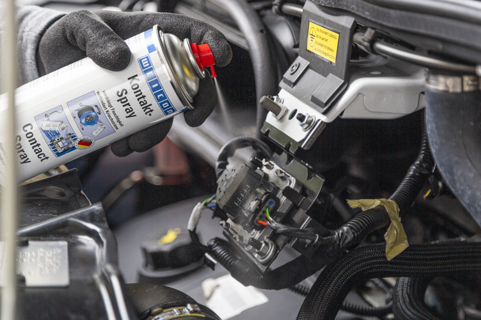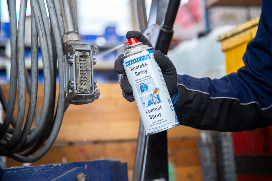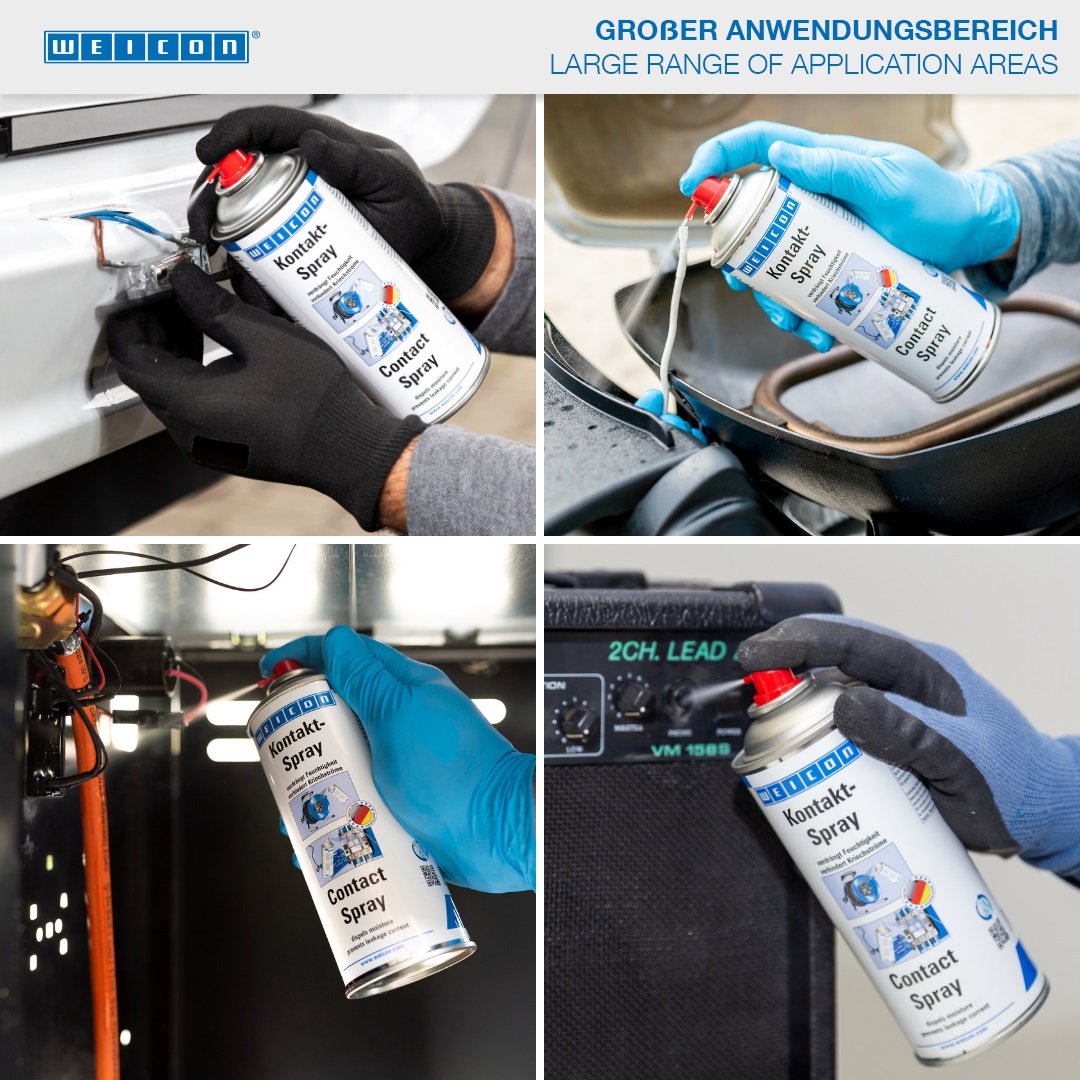 WEICON Contact Spray is based on a special combination of active ingredients for the protection and care of electrical contacts and components. It dispels moisture from electrical contacts, prevents leakage currents and voltage loss and keeps contacts, fuses, cable connections, etc. free of oxidation and sulphide layers. Therefore, WEICON Contact Spray can be used e.g. for fuse boxes, intercoms, garage door motors, sockets, cables and connectors, cable drums and extensions, electric garden tools and lighting systems.