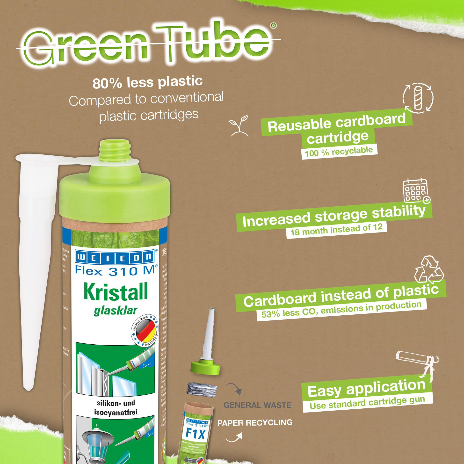 WEICON Flex 310 M Crystal is transparent, strong, paintable (wet-on-wet), sandable, has an outstanding resistance to ageing and good resistance to UV rays. It contains no silicone, isocyanate, halogens or solvents. It has an ISEGA certificate and can be used as an adhesive in the food technology. Flex 310 M Crystal is an elastic adhesive suitable for bonding glass, PC* and acrylic glass*, metals, many plastics, ceramics, wood and stone. The product is crystal clear after curing and is particularly suited for elastic joints where the adhesive should or must not be visible. It can be used in plastic processing, metal construction, tank and apparatus engineering, in ventilation and air conditioning systems, the electrical and lighting industry, in exhibition stand construction and shopfitting, and in all applications where silicones or products containing silicones are not suitable. (* = only for tension-free bonding)