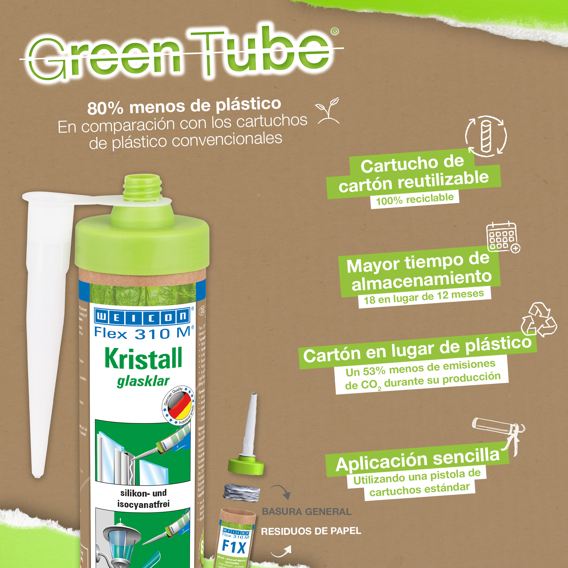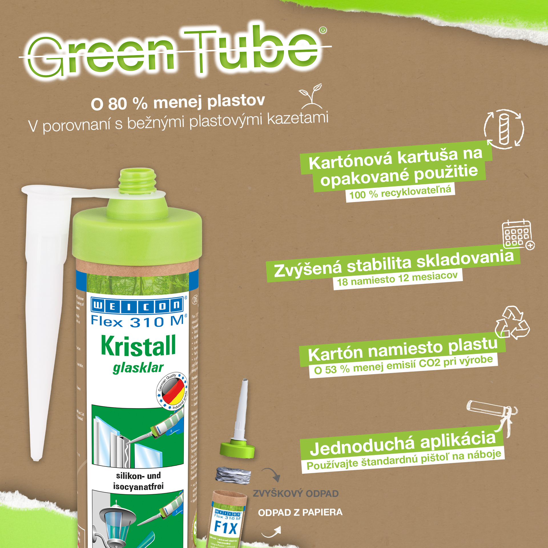 WEICON Flex 310 M Crystal is transparent, strong, paintable (wet-on-wet), sandable, has an outstanding resistance to ageing and good resistance to UV rays. It contains no silicone, isocyanate, halogens or solvents. It has an ISEGA certificate and can be used as an adhesive in the food technology. Flex 310 M Crystal is an elastic adhesive suitable for bonding glass, PC* and acrylic glass*, metals, many plastics, ceramics, wood and stone. The product is crystal clear after curing and is particularly suited for elastic joints where the adhesive should or must not be visible. It can be used in plastic processing, metal construction, tank and apparatus engineering, in ventilation and air conditioning systems, the electrical and lighting industry, in exhibition stand construction and shopfitting, and in all applications where silicones or products containing silicones are not suitable. (* = only for tension-free bonding)