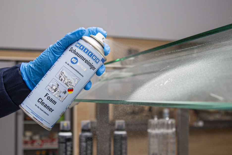 WEICON Foam Cleaner is universally applicable and can be used for the cleaning and degreasing of water-resistant surfaces and for the removal of soilings on plastic, glass and textile surfaces. Due to its NSF A1 registration, the foam cleaner is suitable for use in sensitive areas, such as the food and beverage industry as well as in the pharmaceutical and cosmetics industry. The spray is suitable for the cleaning of conveyor belts with contact to food, for example in production lines or retail shops. It removes soilings on machine housings and cleans scales, flat screens, touch screens, navigation systems and many more. Foam Cleaner eliminates many different impurities, such as oils and greases, fingerprints, soot, nicotine, dust as well as residues of insects. It can be used wherever acidic or alkaline detergents are not allowed.