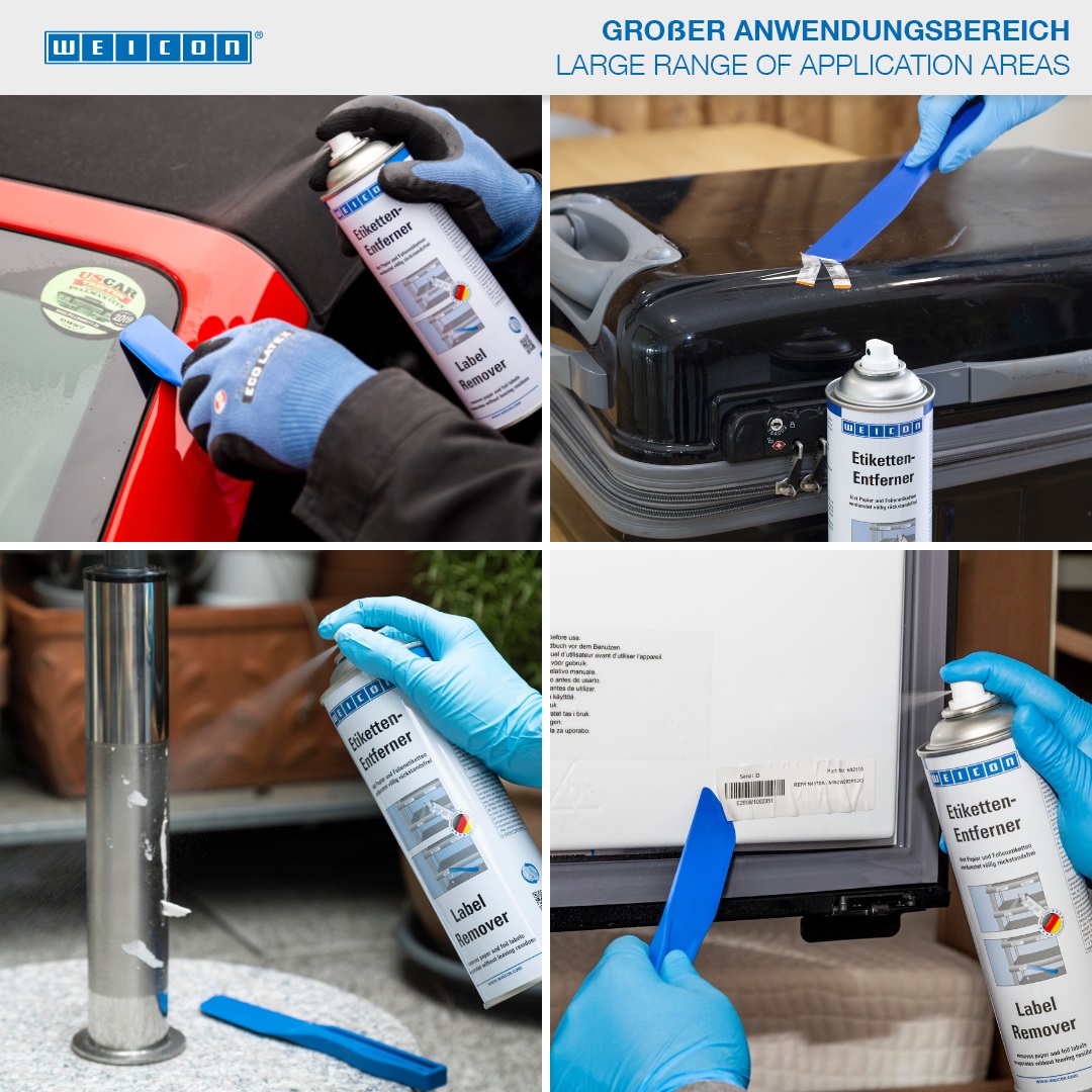 WEICON Label Remover quickly and easily removes paper labels and residues of acrylate and caoutchouc-based pressure-sensitive adhesives. WEICON Label Remover is suitable for many surfaces such as glass, metal, wood, foil and plastic. WEICON Label Remover easily and safely removes adhesive labels, price tags (e.g. incorrect labels), address and product stickers, identification labels, and label residues. It also removes adhesive residues from foil labels such as vignettes on car windshields.