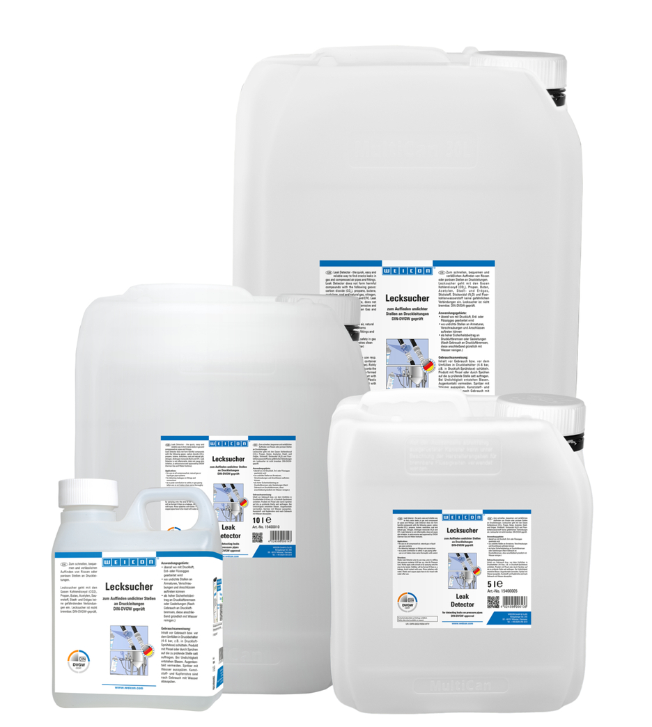 WEICON Leak Detector is used for the fast, convenient and reliable location of leaks (cracks or porous spots) in pressurized pipes. Leak Detection does not form any hazardous compounds with carbon dioxide (CO2), propane, butane, acetylene, oxygen, city or natural gases. It can be used wherever compressed air, natural or liquid gas is processed, and wherever leaky points can occur on fittings, threated joints, and connections. It greatly contributes to the safety of pneumatic brakes and gas lines.