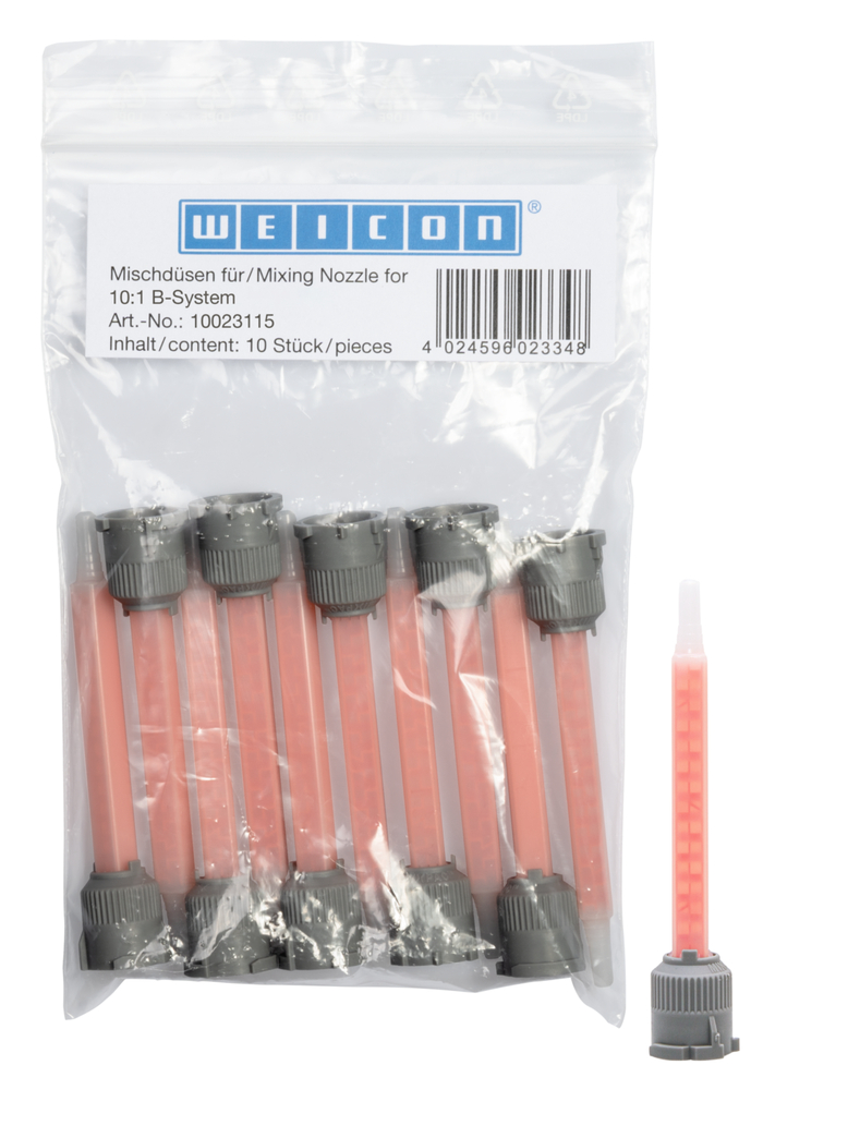 The 10:1 B Mixing Nozzle was specially developed for two-component adhesive systems. The use of the mixing nozzle supports quality assurance in bonding processes and ensures the reproducibility of results. This is especially important for industrial series production. The mixing nozzle supports the high-quality and professional production of bonds and leads to an improvement in bonding processes. Thanks to the geometry of the mixing nozzle, which is precisely adapted to the mixing ratio, the proper quantities of resin and hardener are mixed together at all times. The use of the mixing nozzle ensures safe and clean work processes and increases efficiency by significantly reducing error costs.