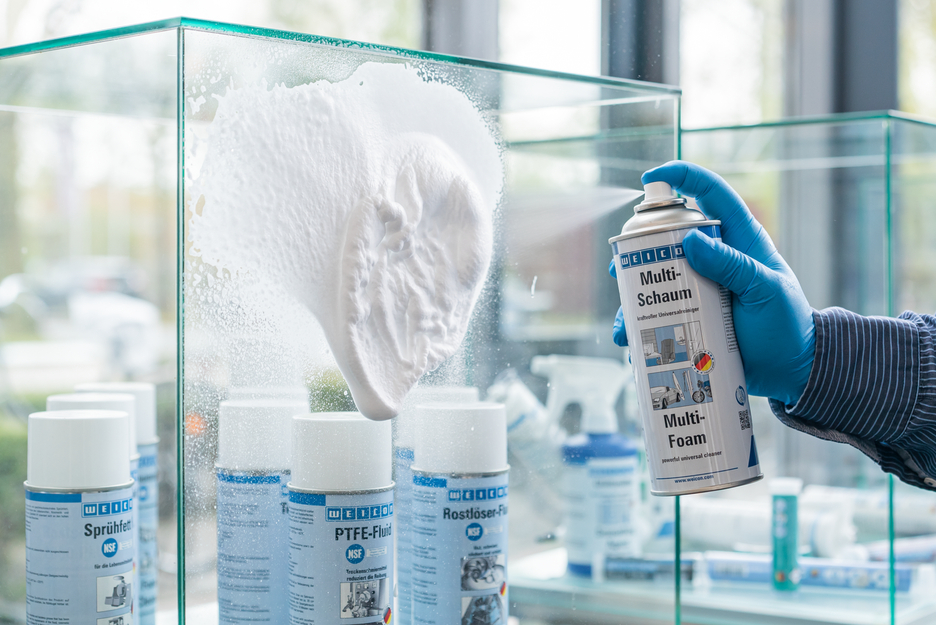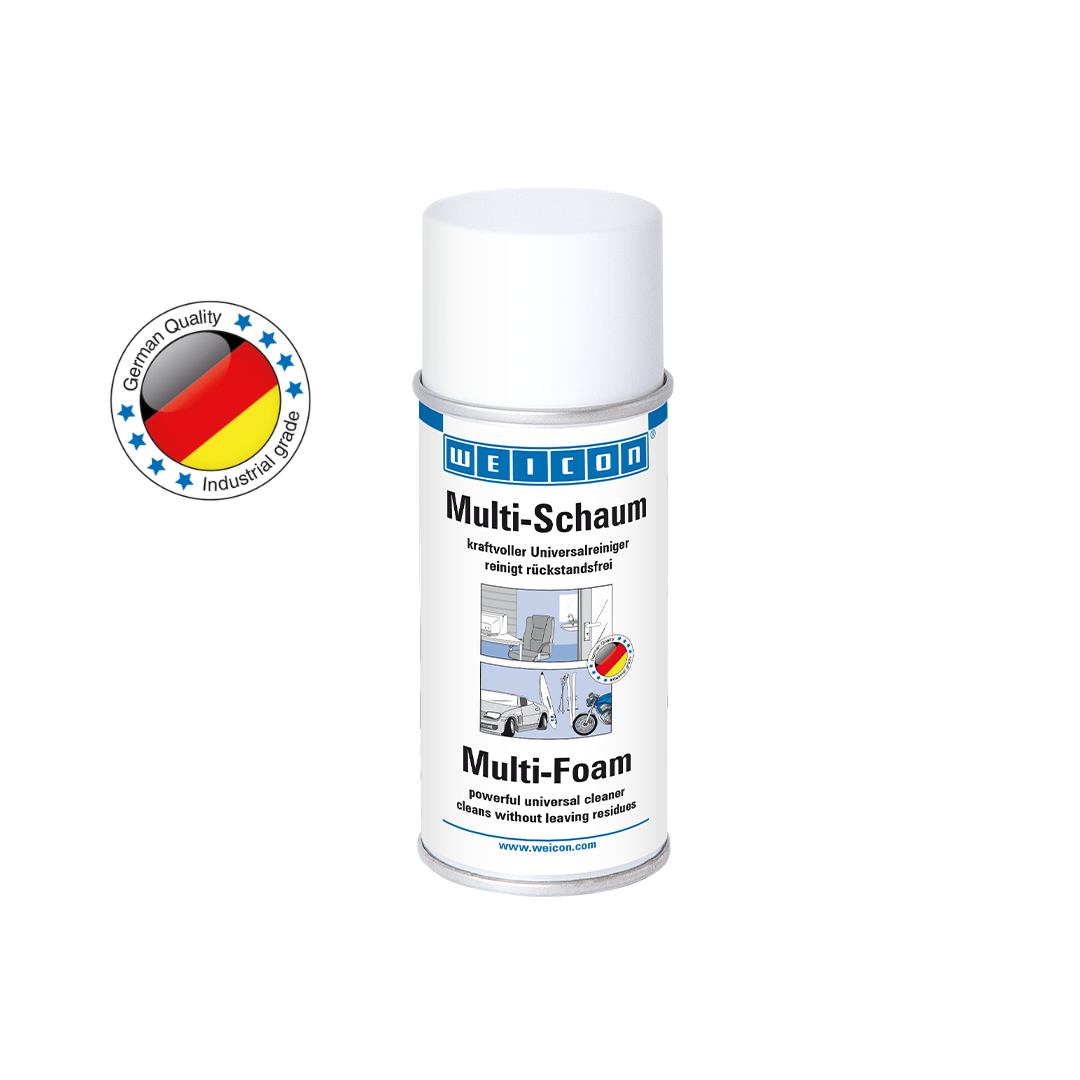 WEICON Multi-Foam is a powerful all-purpose cleaner for residue-free cleaning. It is safe for the environment, free of phosphates and formaldehyde, and contains no corrosive or caustic substances. Multi-Foam can be used to clean many different surfaces such as metal, plastics, glass, ceramics or lacquered and coated surfaces. The spray can be used for various purposes in industrial applications, skilled trades, and around the house.