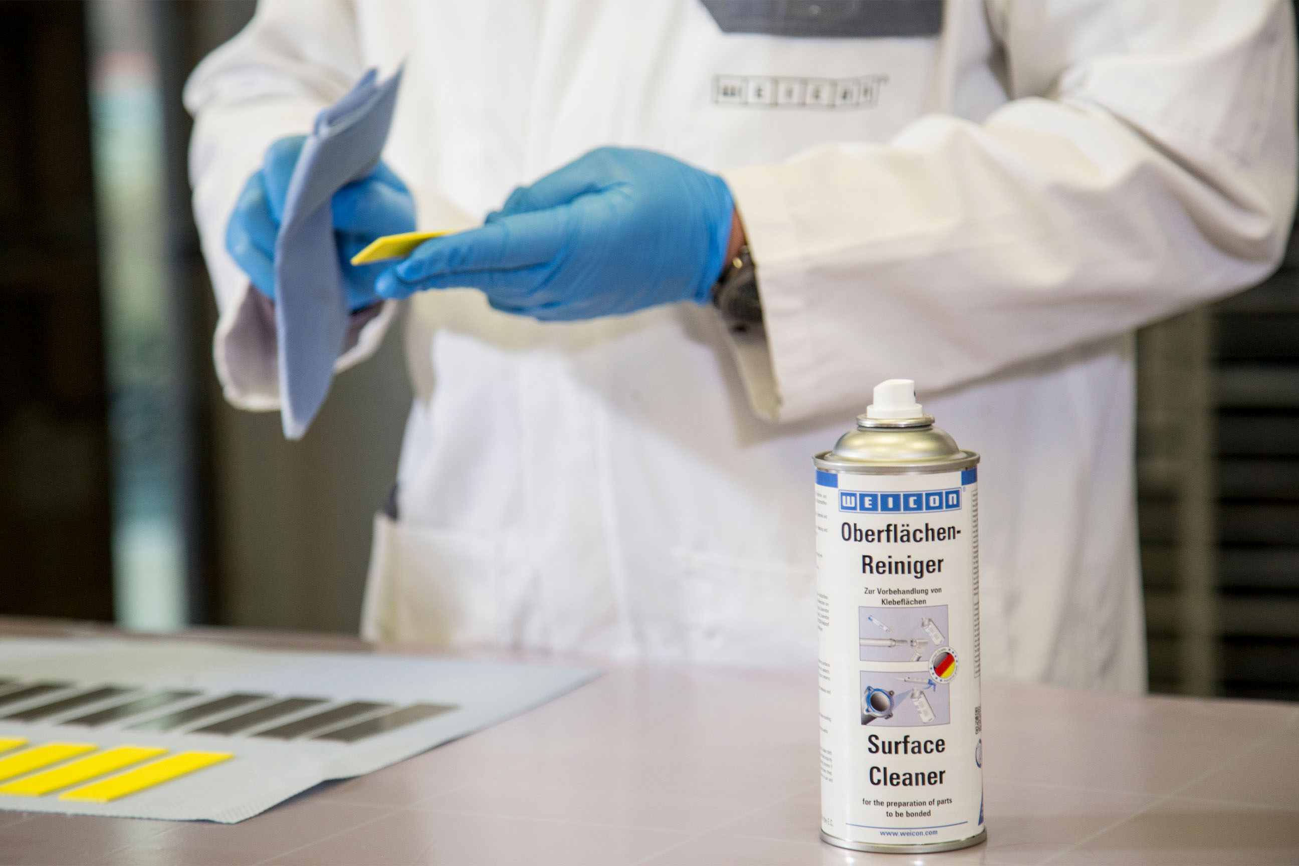 This is because the adhesive’s strength is extremely affected by grease, oil, dust, dirt or silicone spray. Any grease or dirt particles that remain on the surface become part of the adhesive bond and separate the bonded material from the adhesive. The best way to clean the surfaces properly is with a special cleaning spray. Depending on how sensitive the surface is or how coarse the dirt is, we recommend a gentle or powerful cleaning agent.