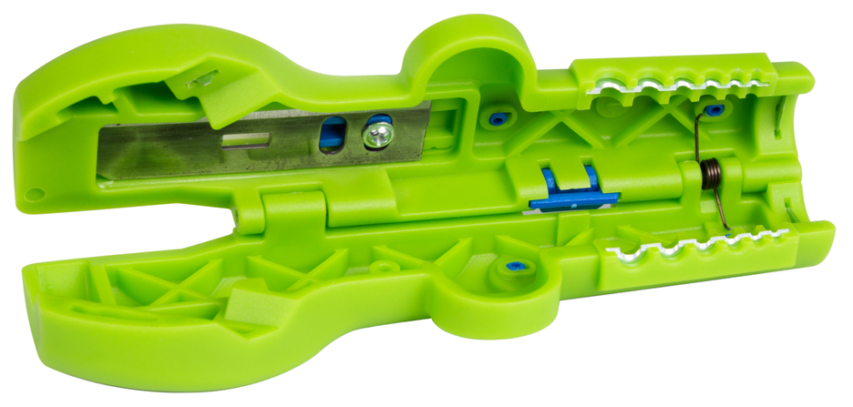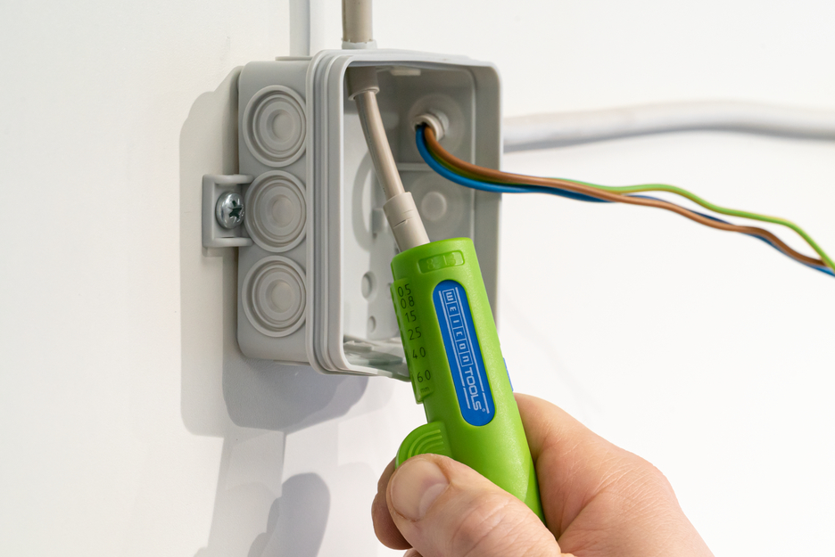 • safe round and longitudinal cutting as well as flush stripping even in hard-to-reach places in ceilings and walls, in junction and distribution boxes, switch cabinets, etc. • no adjustment of the cutting depth: the tool is optimised for working on NYM cables e.g. 3 x 1.5 mm² to 5 x 2.5 mm². • non-slip handle shape and thus easy handling during daily work • fast and fatigue-free work due to new arrangement of blades for longitudinal cutting • 100% made in Germany • made of fibreglass-reinforced polyamide - robust, ergonomically shaped, safe grip • high-grade knife steel from Solingen and thus durable blades • TÜV/ GS tested in terms of work safety The Quadro Stripper No. 16 is a newly developed tool for the professional user in industry and skilled trades. The 4-in-1 tool has several functions: circular cutting - longitudinal cutting - stripping - cutting. That way, several tools can be replaced by one. This saves money and space in the toolbox. The optimally integrated cable guide in the housing ensures safe, precise and convenient stripping of all common round and wet room cables with a diameter of 8.0 - 13.0 mm. (e.g. NYM cables 3 x 1.5mm² to 5 x 2.5mm²). Thanks to the ergonomic handle shape, the tool is particularly comfortable to use. The distinctive handle ensure that the Quadro Stripper No. 16 provides a safe, non-slip grip. This helps to make daily work easier and also improves work safety. Even in hard-to-reach places or in junction and distribution boxes, the tool is suitable for flush cable stripping. Adjusting the cutting depth manually is not necessary. All common stranded and solid conductors with a diameter of 0.5 - 6 mm² can be machined in the integrated stripping sector. The universal tool has a retractable hook blade that can be locked firmly in any position and is easy to change.