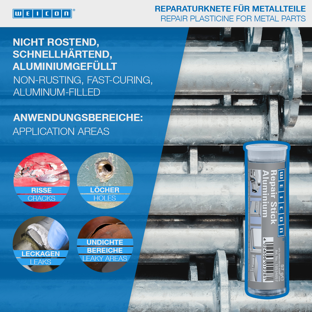 For the quick and non-corrosive repair and bonding of metal components. For the repair of cracks, holes and leaks in car bodies, gearboxes and tanks, window frames and profiles, and boats and models. The WEICON Repair Stick Aluminium can be used in machine and system construction, in the automotive industry, in gear construction, window construction, model building and many other applications.