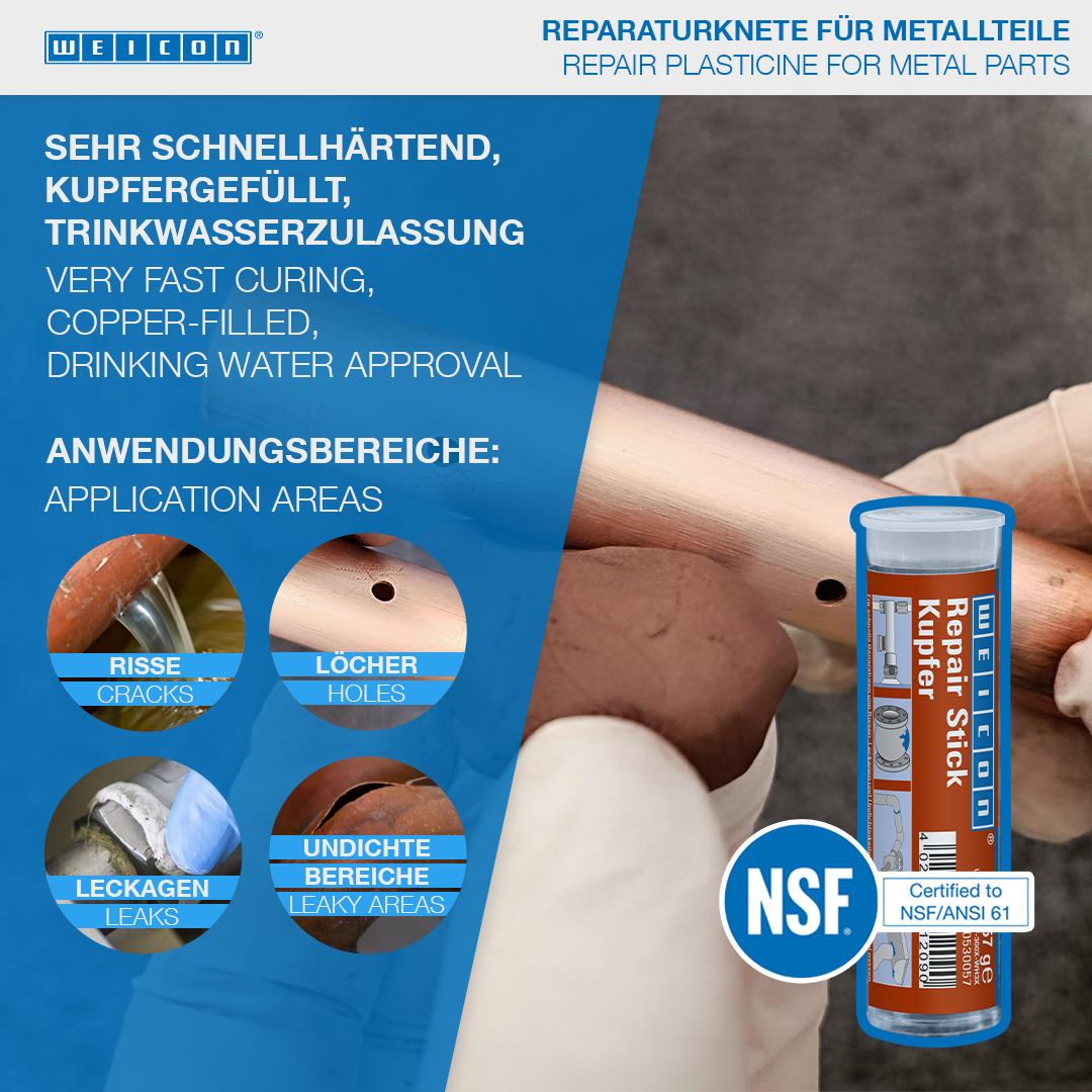 WEICON Repair Stick Copper is suitable for very quick repairs and mending of cracks, leaks and leakages. The epoxy resin system has a very fast working time of only three minutes and can also be used on damp and wet surfaces. With the stick, pipes and pipe bends, fittings and flanges, copper gutters and sheets, water heaters, water tanks, hot and cold water pipes and freezer and air conditioning systems can be repaired and mended quickly and easily. The WEICON Repair Stick Copper can be used in tank construction and apparatus engineering, in the food, cosmetics and pharmaceutical industries and in many other applications.