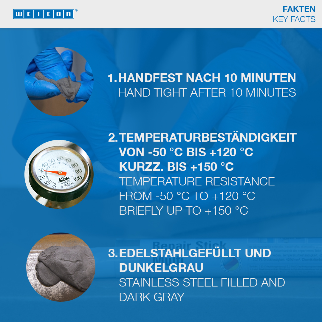 For the non-corrosive repair and reconditioning of stainless steel and other rustproof metals, such as used in tanks and containers, filling and packing machines, pipes, pipelines, pumps and housings. Due to the quick mechanical loading capacity of the mended parts (approx. 60 minutes), expensive and longer downtimes are avoided. The WEICON Repair Stick Stainless Steel can be used in tank construction and apparatus engineering, in the foods, cosmetic and pharmaceutical industries and in many other areas. Due to its special formula and the resulting NSF registration, the Repair-Stick can contribute towards improvements in occupational safety and health protection.