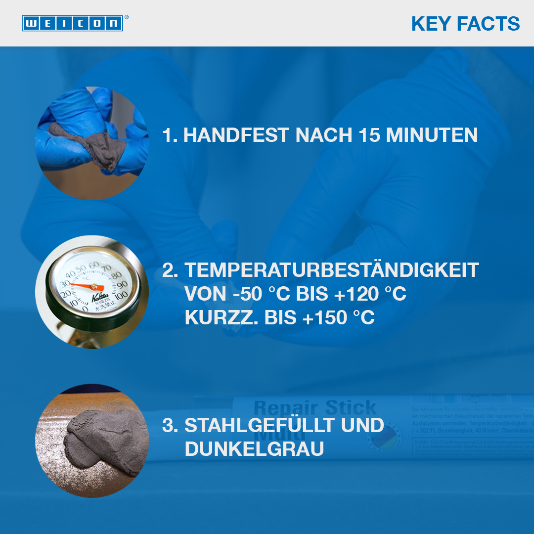 It is particularly suitable for the fast and high-strength repair and bonding of metal parts and for patching and sealing cracks, holes and leaks in machine parts, tanks and pipelines, containers, pumps and housings, balcony railings, banisters, and torn-out threads. The WEICON Repair Stick Steel can be used in machine and system construction, in tank construction and apparatus engineering, in the food, cosmetics and pharmaceutical industries and in many other applications.