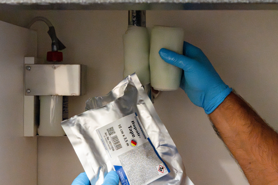 Flexible, durable and self-fusing repair tape made of fibreglass-reinforced plastic for fast emergency repairs in indoor or outdoor areas. The tape is soaked with a special resin and is activated by contact with water. It enables a very easy and fast application as well as very high adhesive strength on nearly all surfaces. After just 30 minutes, the tape is fully cured and hard-wearing. After curing, the tape can be sanded and painted. The tape can be applied without additional tools and is used for reliable and durable repairs in industrial applications, skilled trades, around the house, and in the camping and DIY sector.