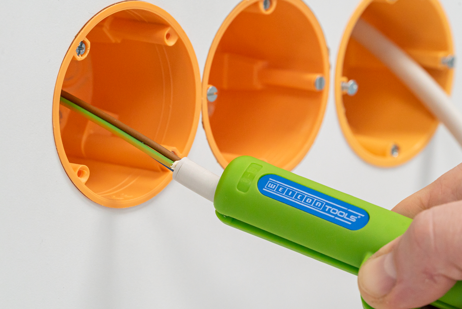 WEICON Stripping Tools enable the fast and safe stripping of all common round cables. The product range of stripping tools includes different types, which provide easy handling and accurate results. • Stripping without adjusting the cutting depth The round cable stripper No. 13 enables fast and convenient stripping of all common round and wet room cables with a diameter of 6-0 - 13.0 mm (e.g. NYM cables 3 x 1.5 mm² to 5 x 2.5 mm²). Adjusting the cutting depth manually is not necessary. The new working range is thus also suitable for smaller wire diameters from 6 mm, such as 3 x 0,75 mm². • ergonomics Thanks to the ergonomic handle shape, the tool is particularly comfortable to use. The distinctive handle ensure that the round cable Stripper No. 13 provides a safe, non-slip grip. This helps to make daily work easier and also improves work safety. • optimal access The rounded and space-saving tool head perfectly matches the modern wall box geometry. The longer shape makes access even easier when stripping in deep-set cavity wall boxes and spaces difficult to reach. • durable blades Due to the new blade arrangement, clogging of the electro-galvanised knives due to residue of cable sheaths is prevented. • precision For possible small series or for producing wires with the same strip length, a length stop is integrated in the housing. The length stop can be placed in the range from 3 to 10 cm in steps of 0.5 cm • Safe storage A fastening clip ensures safe storage.. • quality – 100% made in Germany Made of robust, fibreglass-reinforced polyamide. High-grade knife steel made in Solingen and thus durable blades.
