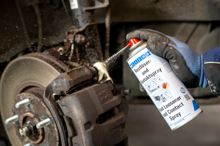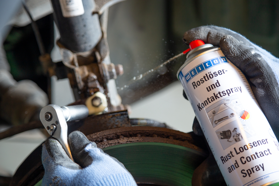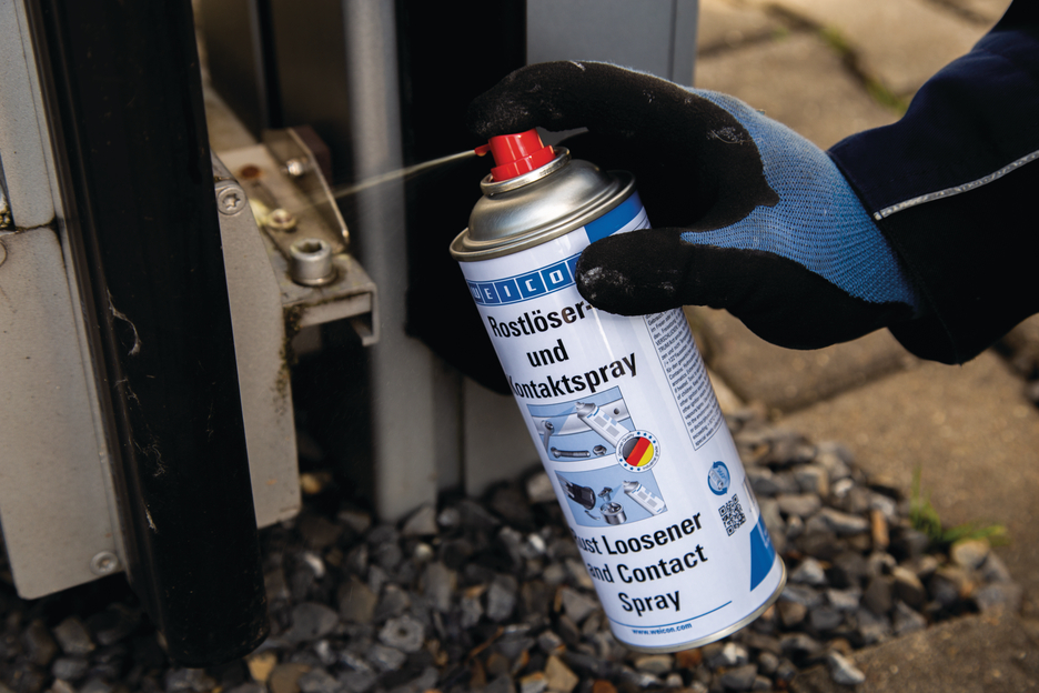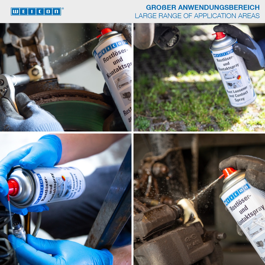The six-fold function of WEICON Rust Loosener and Contact Spray makes it indispensible for repairs, maintenance and service works. Thanks to its excellent capillary action, Rust Loosener and Contact Spray reaches even extremely narrow spaces. The 3-way spray valve makes it possible to work in any position (even overhead). WEICON Rust Loosener and Contact Spray loosens rusted and seized parts, screws, bolts, joints and hinges, dispels water from ignition systems, secures the function of mechanical parts and contacts, e.g. on distributor caps and spark plugs, sustainably protects against corrosion and oxidation, provides long-lasting lubrication to sliding surfaces, and cleans and maintains metal surfaces, mechanical parts and electrical systems.