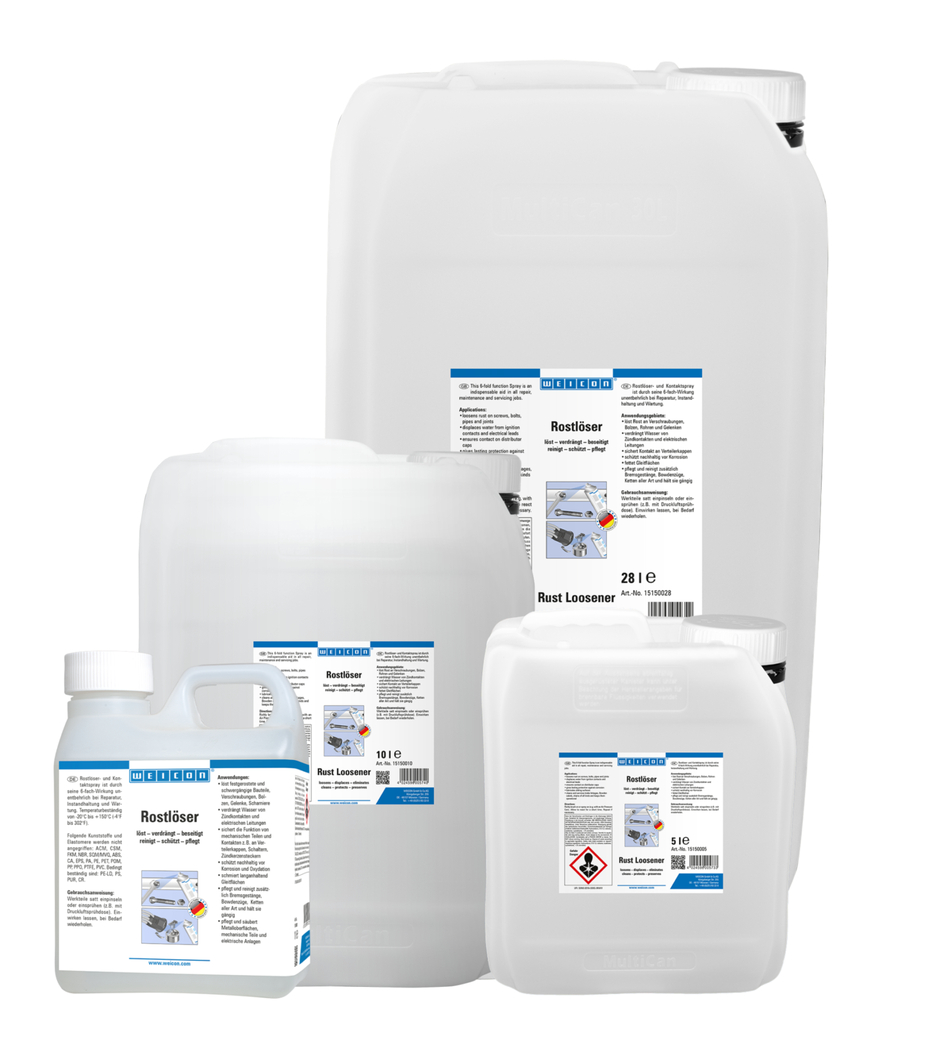 WEICON Rust Loosener‘s six-fold function makes it indispensible for repairs, maintenance and servicing. Thanks to its excellent capillary action, Rust Loosener reaches even the smallest cavities. It loosens rusted and stiff parts, screws, bolts, joints and hinges, permanently protects against corrosion and oxidation. WEICON Rust Loosener durably lubricates sliding surfaces and cleans and cares for metallic surfaces, mechanical parts and electrical systems.
