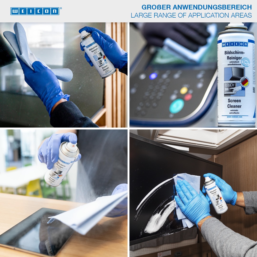 WEICON Screen Cleaner is a special cleaner for the cleaning and care of sensitive plastic and glass surfaces. It is antistatic and antireflective. Its antistatic effect provides a dirt and dust-rejecting surface. WEICON Screen Cleaner gently removes contaminations caused by insects, dirt, dust, grease and nicotine without leaving streaks. WEICON Screen Cleaner can be used on all flat and plasma screens (computers, mobiles, laptop computers, televisions, scanners, copy machines, etc.) and plastic housings (on computers, scanners, copy machines or televisions).