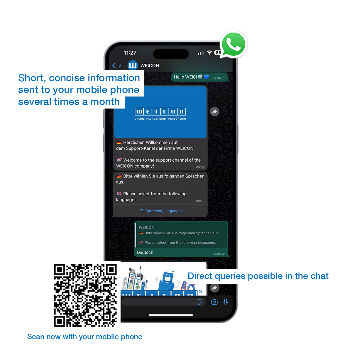 Would you like to contact us anytime and anywhere, send us photos of your application or use the WEICON TOOLS Finder? Do you have questions about our products, are you looking for the right contact person or would you like to order via WhatsApp quickly and easily? We have made all this possible for you! Use our WhatsApp service or subscribe to our WhatsApp newsletter or our new WhatsApp channel.