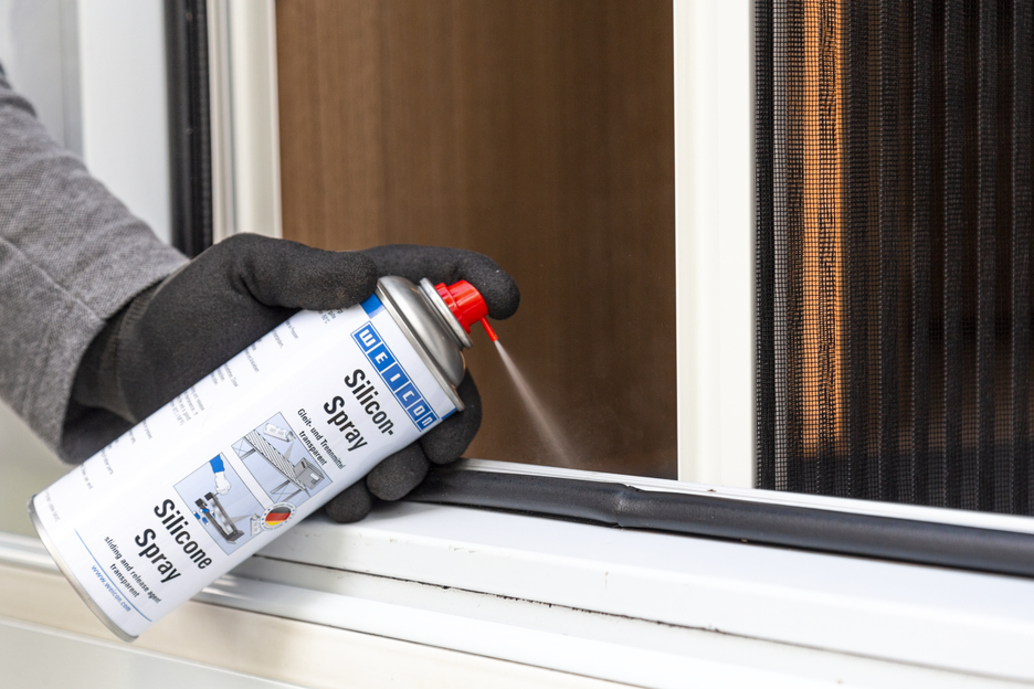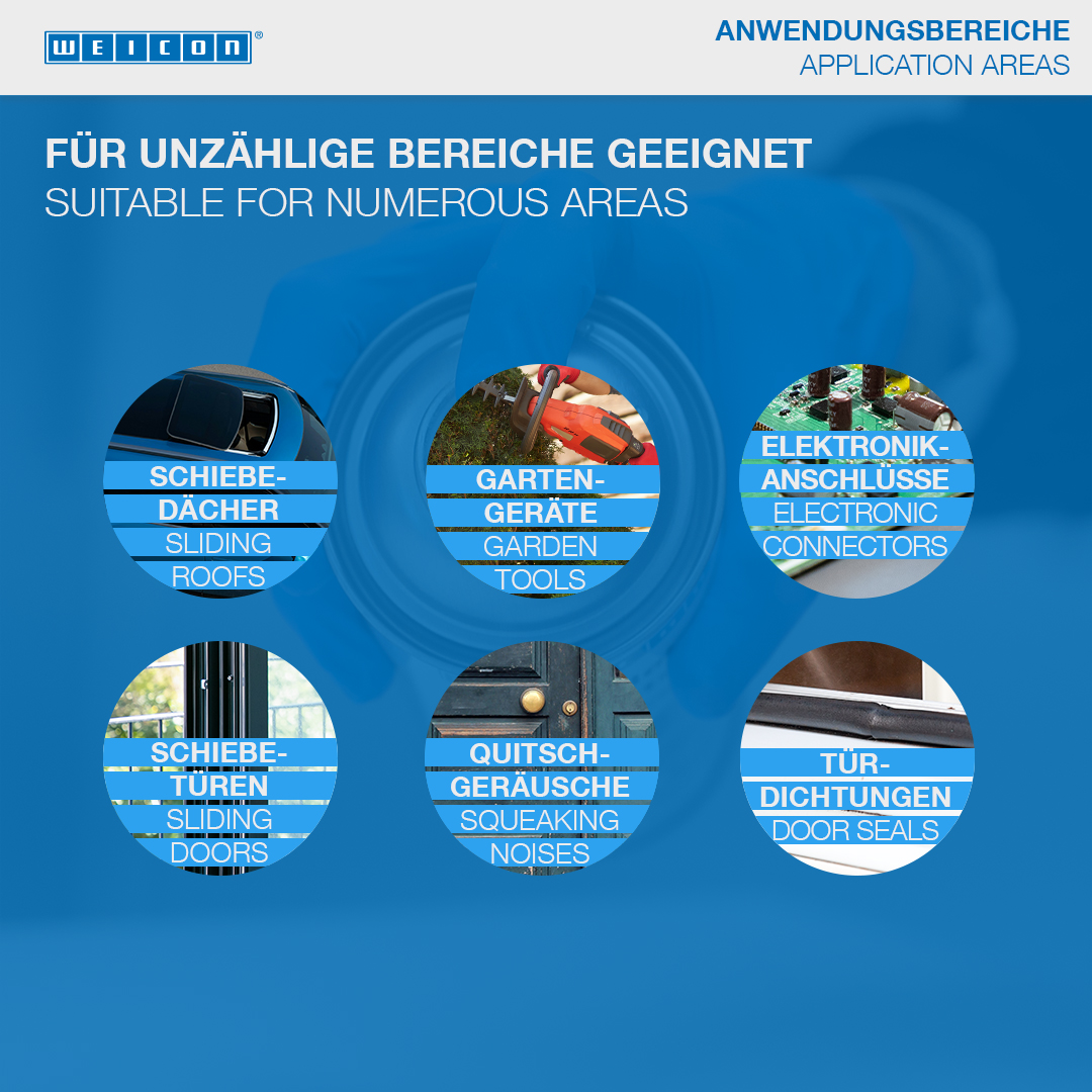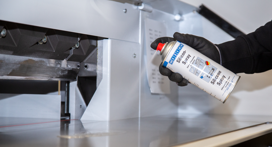 WEICON Silicone Spray is a sliding and release agent as well as a preservative and care product for plastic, rubber and metal. The spray provides a durable separating film and good surface properties and is temperature-resistance up to +250 °C (+482 °F). Silicone Spray prevents the formation of adhesive residues on presses and guides, prevents products from sticking to conveyor belts, chutes and sliding ways, protects electrical contacts from moisture, preserves rubber, plastic and metal parts, protects rubber parts from becoming brittle, freezing and sticking, and allows sunroof rails, seat tracks and seatbelt to run smoothly.