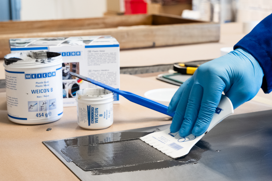 The epoxy resin system WEICON B is particularly suitable for detailed reproductions in model and mould making, for the production of tools, templates, gauges and clamping devices, and for filling blowholes and microporosities on castings and steel parts as well as for general repair works where a steel-filled casting compound is advantageous. The reconstructing of severely damaged steel components with WEICON B causes no thermal distortion of the components and thus no impairment of the metal structure, as for example during weld overlay. It can be used in mechanical engineering, toolmaking, model and mould making as well as many other areas.