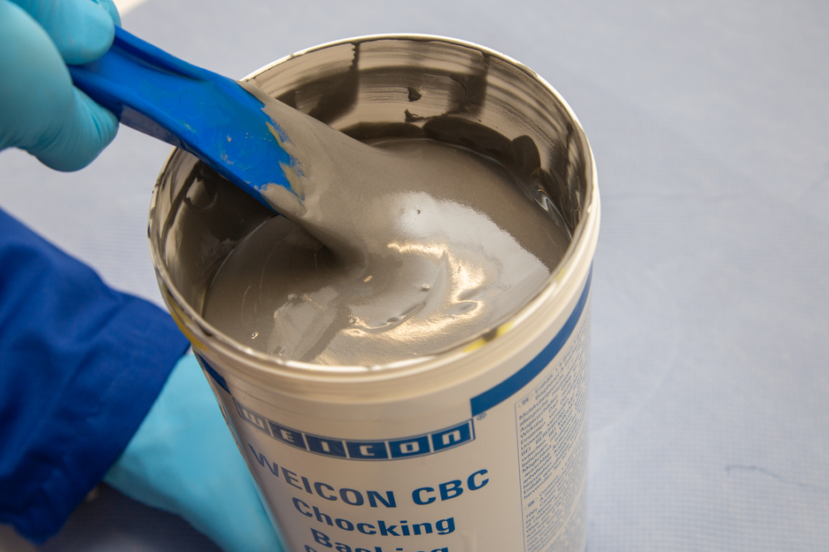 WEICON CBC is suitable for the shimming and backfilling of systems difficult to align in the industrial and maritime sector. The "ABS Product Design Assessment” certified system serves as a replacement for fittings and worn metal sheets and ensures the direct contact to foundation plates. The special epoxy resin system has a low viscosity, is very flowable and self-levelling. It has a pot life of 45 minutes and cures nearly shrink-free. It provides a permanent high-static stability and has a high resistance to ageing. The epoxy resin system adheres particularly well to steel and concrete. It has a good compressive strength and is resistant to oils, fuels and many chemicals. It is vibration-resistant as well as temperature-resistant. Due to almost no cure shrinkage, machines and systems keep their specific alignment after the casting of WEICON CBC.