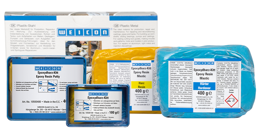WEICON Epoxy Resin Putty is a metal-free, kneadable 2-component compound. The product can be used for various purposes. It is suitable for the reconditioning and repair of castings, the rebuilding of shafts, slide bearings, pumps and housings, the renewal of defective threads, the production of templates and models, and for repair works on aluminium, light metal and injection moulded parts. The compound can be used to seal pipes and tanks and to fix screws and hooks. It can be used to remove corrosion damage and pitting or to repair holes and blowholes. Epoxy Resin Putty adheres particularly well to all metals and also to ceramics, glass, stone, concrete, wood, rubber and many plastics. When cured, WEICON Epoxy Resin Putty is machinable, paintable and resistant to petrol, oil, esters, salt water and most acids and alkalis. It has a high-temperature-resistance up to +200 °C (+392 °F), is non-magnetic and non-corrosive. Due to the simple mixing ratio of 1:1 by weight and volume, resin and hardener can be portioned very easily in the desired quantity. WEICON Epoxy Resin Putty can be used in machine construction, tool construction, model and mould making, and in many other industrial applications.