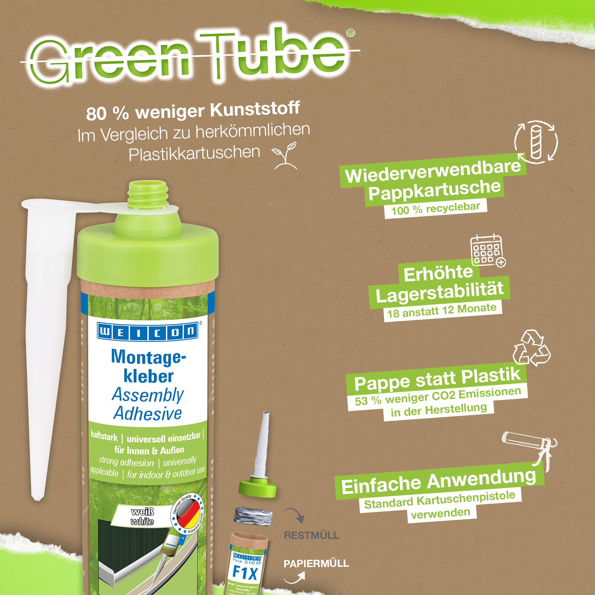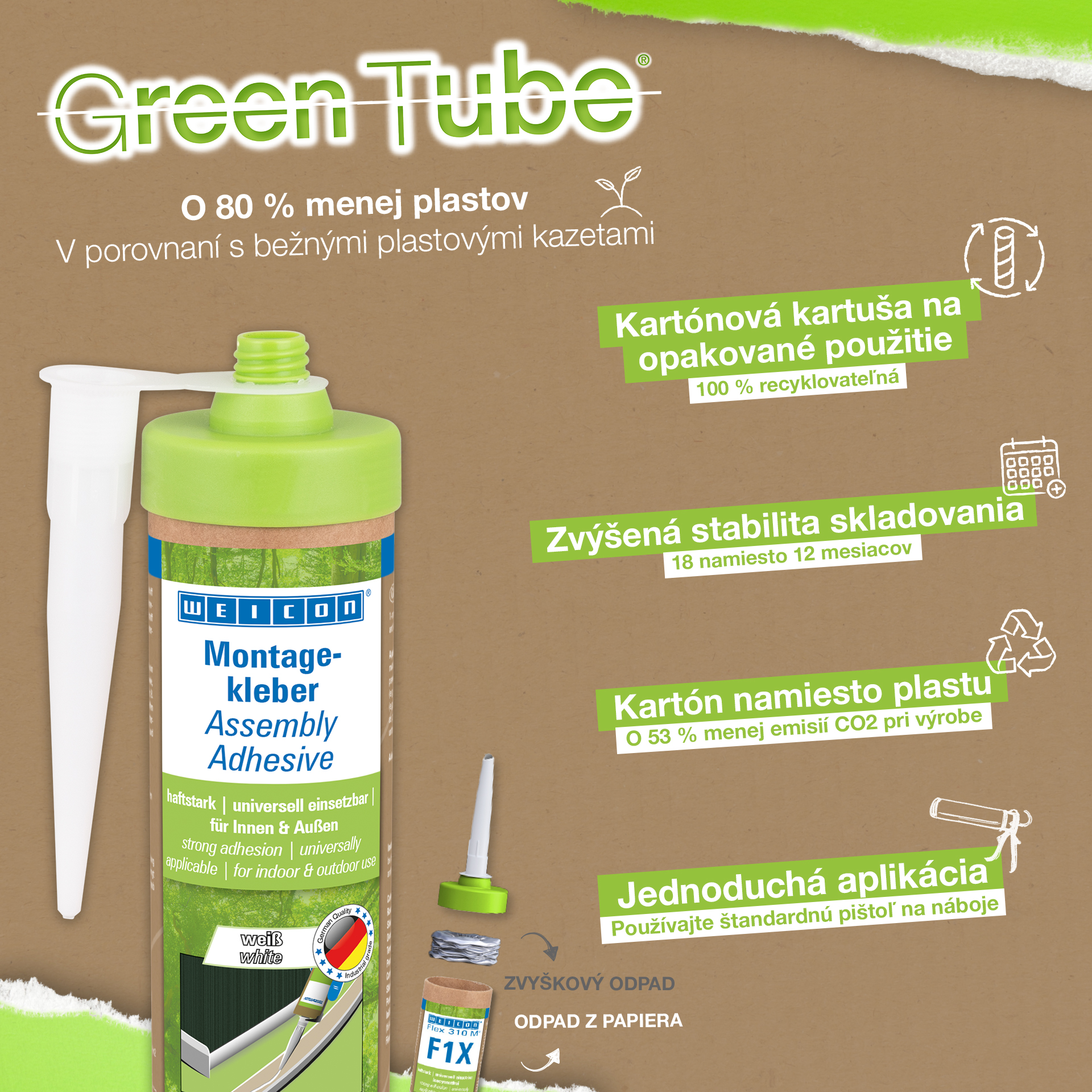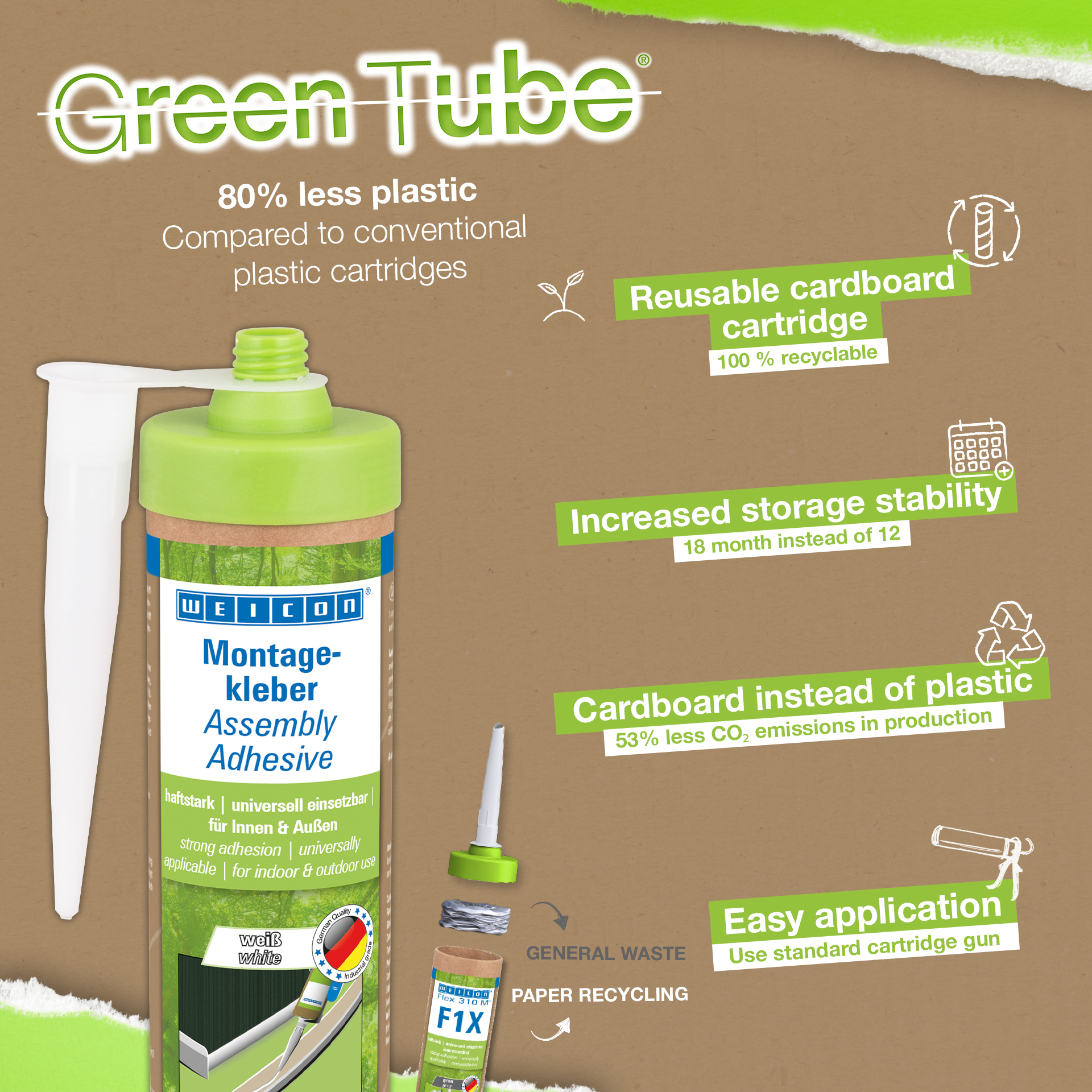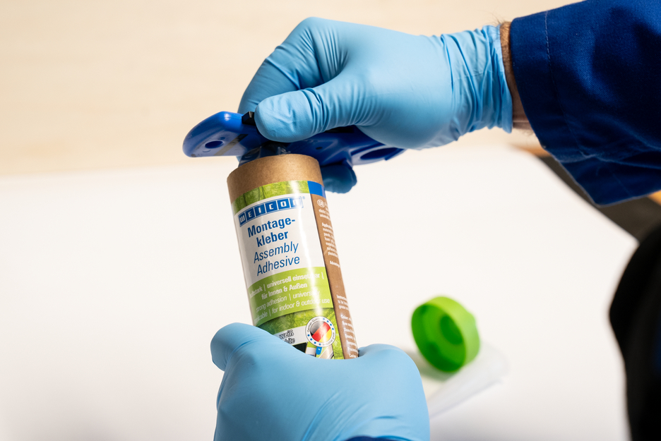 WEICON Assembly Adhesive is a strong dispersion acrylic adhesive for assembly, repair and touch-up work. The adhesive has a high initial adhesion and final strength and cures rapidly. After drying, the Assembly Adhesive can be sanded and plastered over and can be painted over with commercially available paints and varnishes. The adhesive is temperature-resistant in a range from -20°C to +80°C and is suitable for both indoor and outdoor applications. The white flexible adhesive is low-emission and free from solvents. The Assembly Adhesive is universally applicable and can be used for a wide variety of applications. It is ideal, for example, for surface bonding of wood-based materials (such as skirting boards, decorative mouldings, panels or chipboard), PVC, polystyrene, polystyrene foam boards, PU rigid foam (e.g. insulation boards and cable ducts), mineral materials (e.g. tiles) and metals on absorbent substrates such as plaster, concrete, fibre cement, plasterboard and untreated wood. Eco-friendly packaging – same strong performance! Green Tube, the sustainable packaging: the tip and lid are made from 100% recycled plastic, and the cartridge body is made entirely of cardboard. This means lower CO₂ emissions and reduced plastic use compared to conventional cartridges – all without compromising on performance!