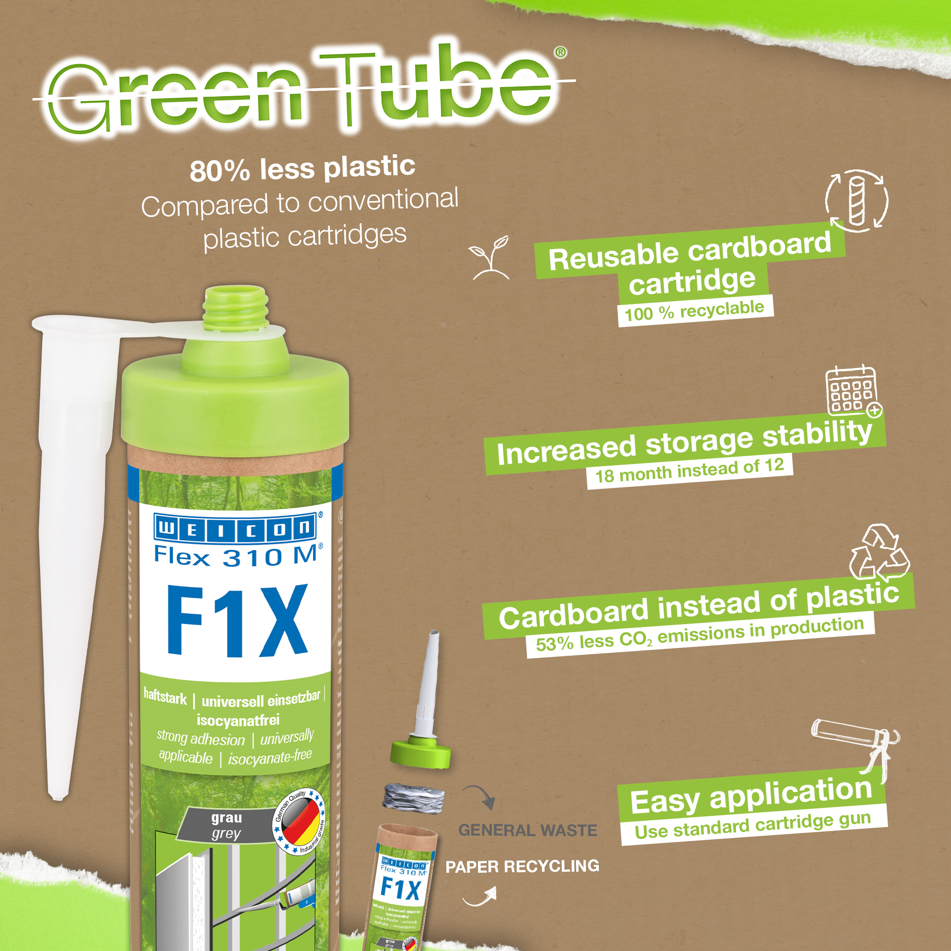 WEICON Flex 310 M F1X is an elastic adhesive and sealant based on MS polymer. The grey adhesive is very strong and universally suitable for permanently fixing almost all materials to a variety of surfaces. Thanks to the very high initial adhesion, bonding is possible on vertical surfaces and even overhead, both indoors and outdoors. For example, Flex 310 M F1X can be used to bond metals, many plastics, ceramics, wood, glass and stone to each other. The permanently elastic adhesive can be painted over “wet on wet”, is sandable, weather-resistant, moisture-resistant, ageing-resistant, mould-resistant and UV-resistant. It is briefly (up to 30 minutes) resistant to temperatures up to 180°C and can be powder-coated after a curing time of four days. The adhesive and sealant is free of silicone, isocyanates, halogens and solvents and is non-corrosive. Flex 310 M F1X can be used for fixing skirting boards, acoustic panels, strips, frames, panels, boards, tiles, stones and EPDM foil. It can be used in drywall and interior construction, metal construction, tank and apparatus construction, container construction, ventilation and air conditioning technology, trade fair and shop construction, yacht and boat building and wherever silicones or products containing silicone are not suitable. Eco-friendly packaging – same strong performance! Green Tube, the sustainable packaging: the tip and lid are made from 100% recycled plastic, and the cartridge body is made entirely of cardboard. This means lower CO₂ emissions and reduced plastic use compared to conventional cartridges – all without compromising on performance!
