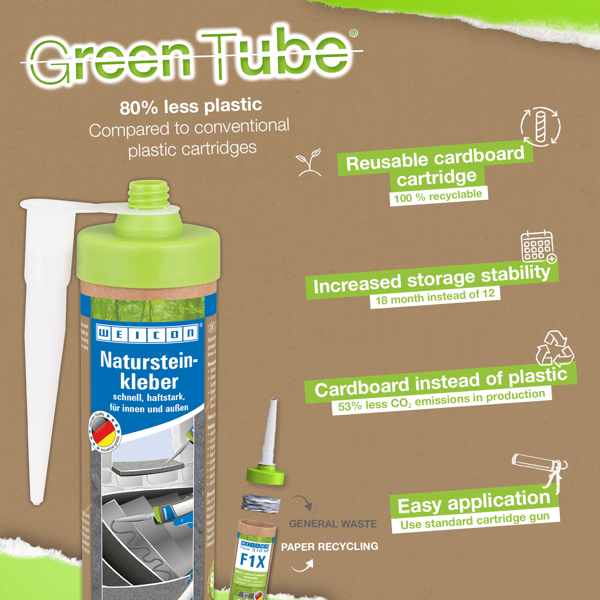 WEICON Natural Stone Adhesive is a strong adhesive for fixing natural stone, stone and ceramics. Thanks to its very high initial adhesion and rapid build-up of adhesive strength, bonding is even possible on vertical surfaces such as walls. The stone adhesive is suitable for many indoor and outdoor applications. It is frost-proof, has a high temperature resistance of -40°C to +90°C as well as high weather and UV resistance. The Natural Stone Adhesive hardens quickly and has a very high final strength. After curing, the adhesive can be sanded and remains elastic to compensate for movements. The stone adhesive is silicone-free, isocyanate-free, halogen-free and solvent-free. It can be used in a wide variety of applications, e.g. for bonding window sills, tiles, skirting boards, decorative mouldings or stair treads. WEICON Natural Stone Adhesive adheres very well to a wide variety of materials, such as wood, wood-based materials, plastics, metals, glass and mineral substrates. It is available in grey and white.