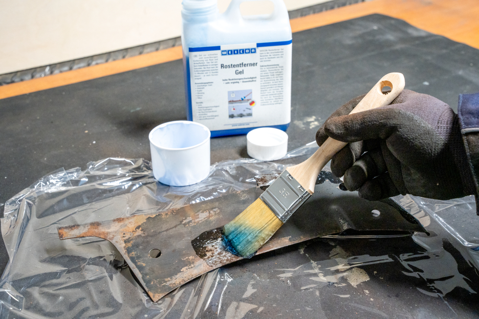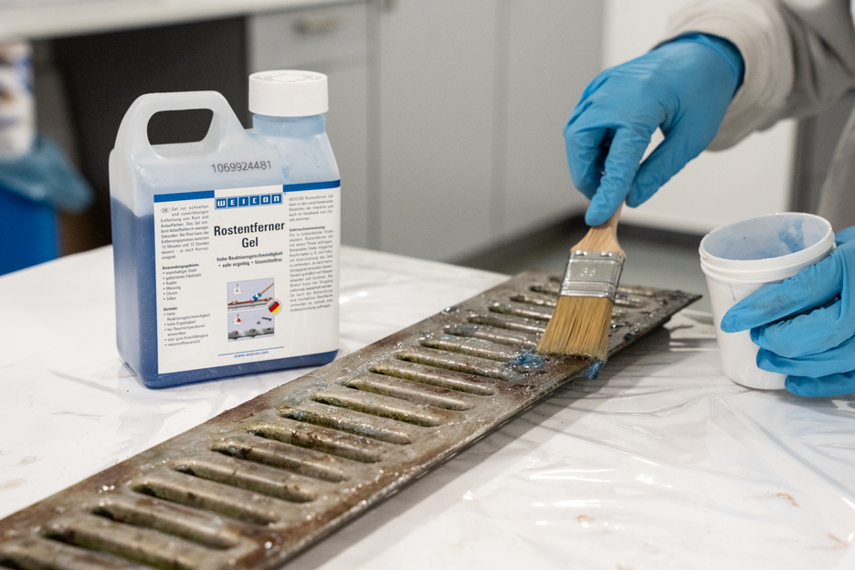 Gel for fast and reliable removal of rust and tarnish. Rust Remover Gel can be used on ferrous steel, brushed stainless steel, copper, brass, chrome and silver. It has a high reaction speed, penetrates very well and is very economical. The gel removes tarnish in just a few seconds. With rust, the removal process can take between 15 minutes and 12 hours – depending on the degree of corrosion. The blue gel does not need to be heated for application but can be used at room temperature. This solution has a natural, solvent-free composition and ensures gentle rust removal. WEICON Rust Remover Gel can be used in various areas of industry and trade.