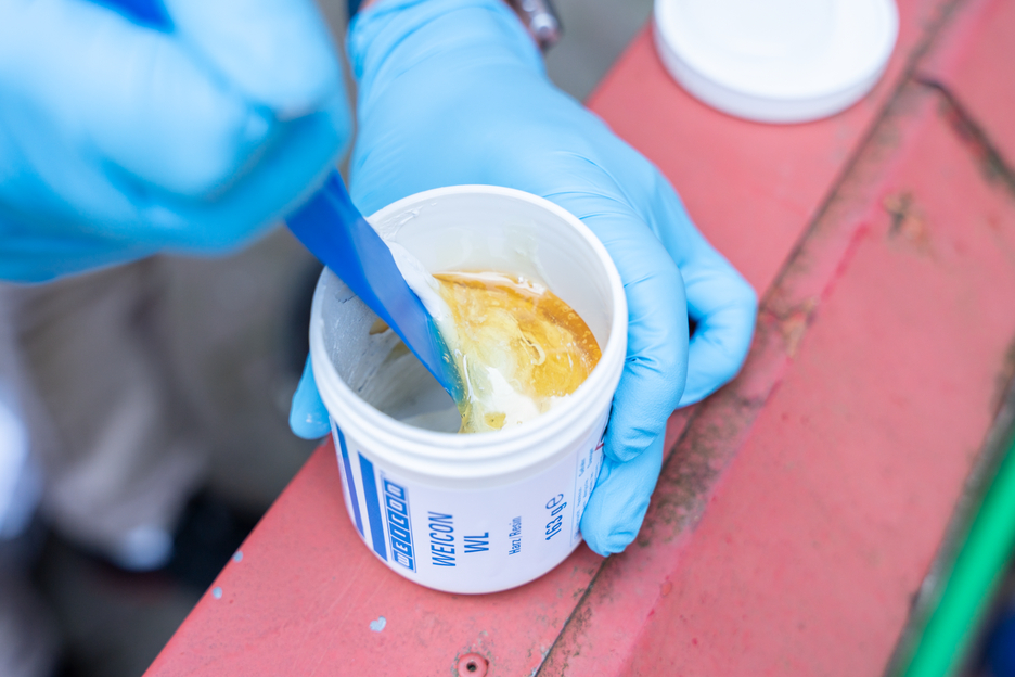 The WEICON WL epoxy resin system is used to coat surfaces that are subject to stresses. It has a high adhesive strength, especially on stainless steel. It is liquid, sprayable, spreadable (can be applied with a brush), self-levelling, retains residual elasticity, is ceramic-filled and chemical-resistant. Owing to its long pot life, WEICON WL can be used for applications with higher ambient temperatures or for larger surfaces. Due to the high flowability of WEICON WL, it is important to ensure a low layer thickness and to observe the layer sequence time. WEICON WL is well suited for a system build-up in combination with other Plastic Metal types. For example, the 2-component epoxy resin can be used as a primer when lining pump casings made of stainless steel that are subject to heavy stress. The surface coating can be used in the field of wastewater technology, on pumps, in water pumping, in mechanical and plant engineering, in apparatus engineering and in many other areas of industry.