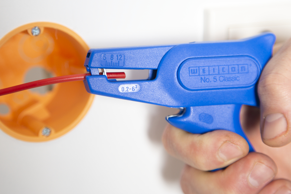 • automatic wire stripper for all common stranded and solid conductors (0.2 – 6.0 mm²) • very easy to operate • integrated, well-accessible side cutter up to 2 mm Ø • precise working thanks to optical length scale (5 – 12 mm) • low weight ensures fatigue-free working • replaceable blades • 100 % made in Germany • made of fibreglass-reinforced polyamide - robust, ergonomic shape, safe grip • high-grade knife steel made in Solingen and thus durable blades • automatic wire stripper for all common stranded and solid conductors from 0.2 to 6.0 mm². The wire stripper has a scanning system, which automatically adjusts to the respective wire diameter and thus enables fast and easy stripping. This prevents damage to the inner conductor. The tool is easy to operate with smooth-running mechanisms. Thanks to an optical length scale (5 to 12 mm), wires can be stripped with millimetre precision. A well-accessible side cutter is integrated in the tool. This cuts cables up to a diameter of 2 mm. The low weight of the tool ensures fatigue-free working.