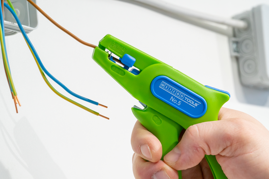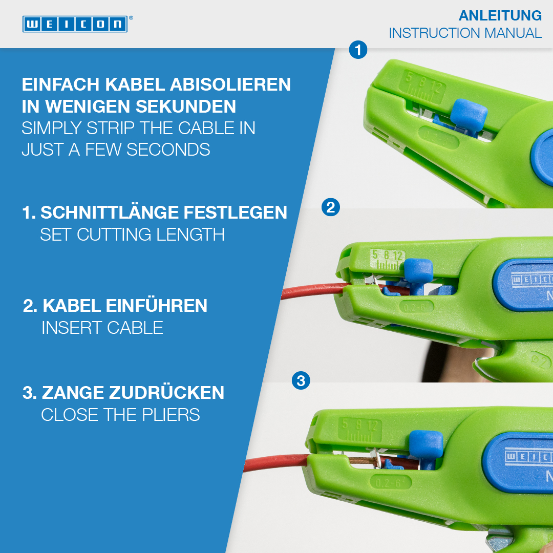 • automatic wire stripper for all common stranded and solid conductors (0.2 – 6.0 mm²) • very easy to operate • integrated, well-accessible side cutter up to 2 mm Ø • precise working thanks to adjustable length stop (5 - 12 mm) • space-saving due to locking of the stripper • low weight ensures fatigue-free working • replaceable blades • 100% made in Germany • made of fibreglass-reinforced biopolymer such as polyamide - robust, ergonomic shape, safe grip • high-quality blade steel from Solingen and thus durable blades • TÜV/ GS-tested for work safety Automatic wire stripper for stripping all common stranded and solid conductors of 0.2 to 6.0 mm². The wire stripper has a scanning system, which automatically adjusts to the respective wire diameter and thus permits fast and simple dismantling and stripping and prevents damging the inner conductors. The tool is easy to operate with smooth-running mechanisms. The adjustable length stop (5 - 12 mm) allows cables to be cut to size. The length stop can also be removed, if required. A well-accessible side cutter is integrated in the tool. This cuts cables up to a diameter of 2 mm. Thanks to the locking mechanism, the stripper can be easiliy and safely stored. The low weight of the tool ensures non-tiring working.